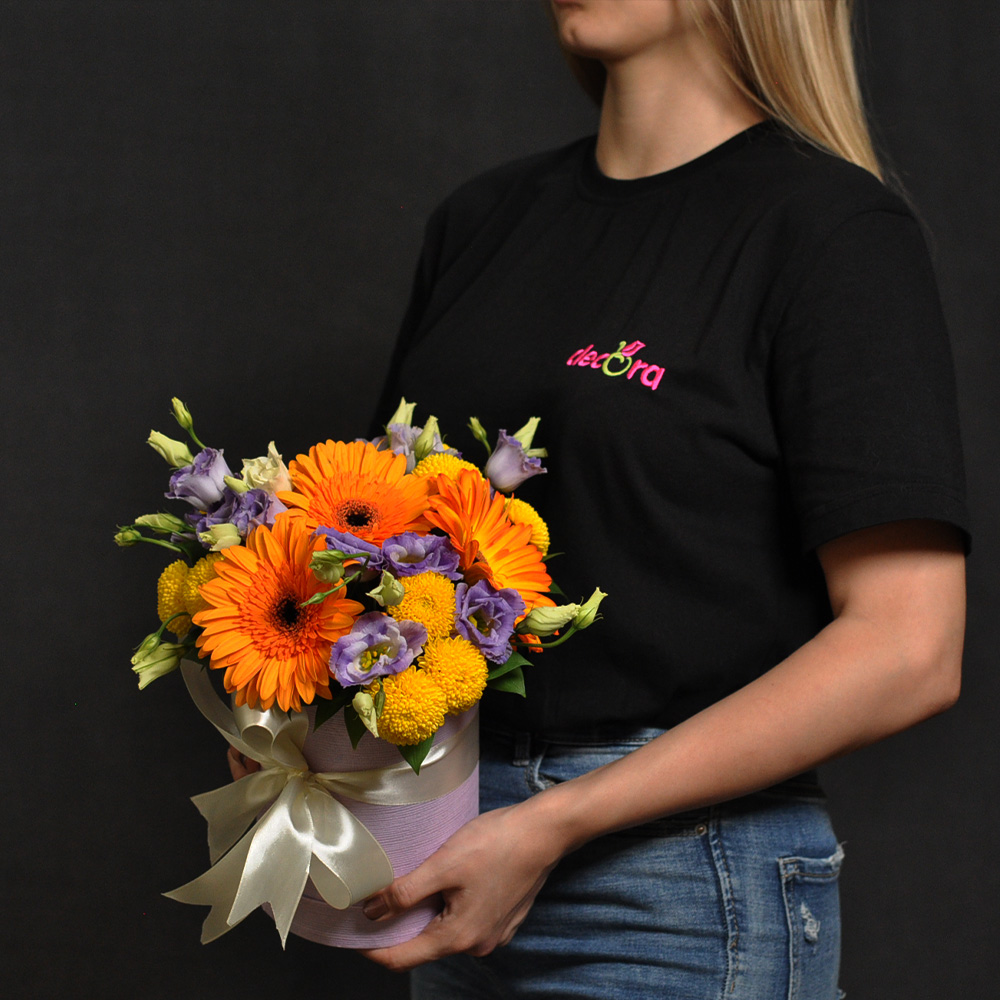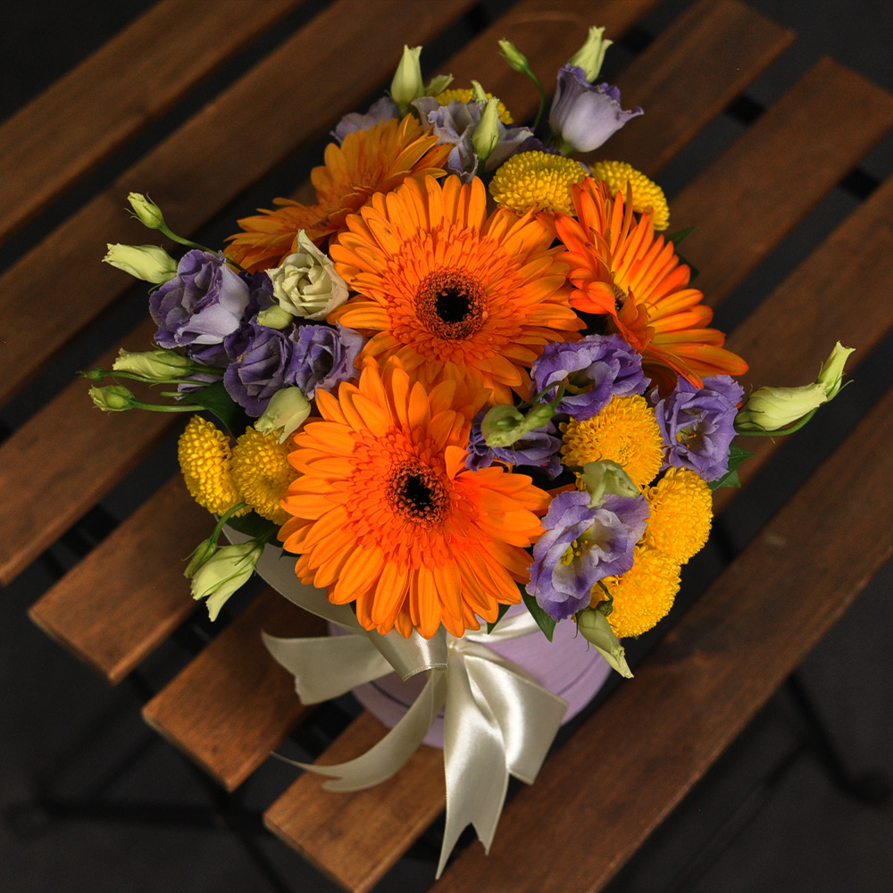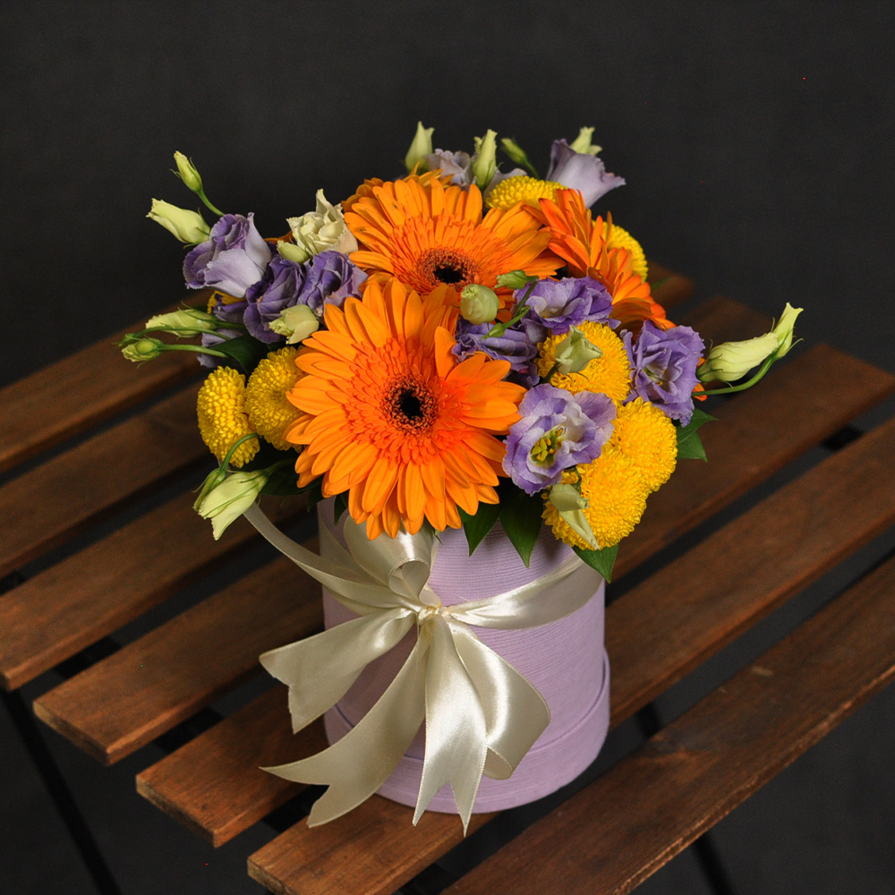 Aranžman u boxu sa lizijantusom,gerberom,hrizantemom i pratećim zelenilom.