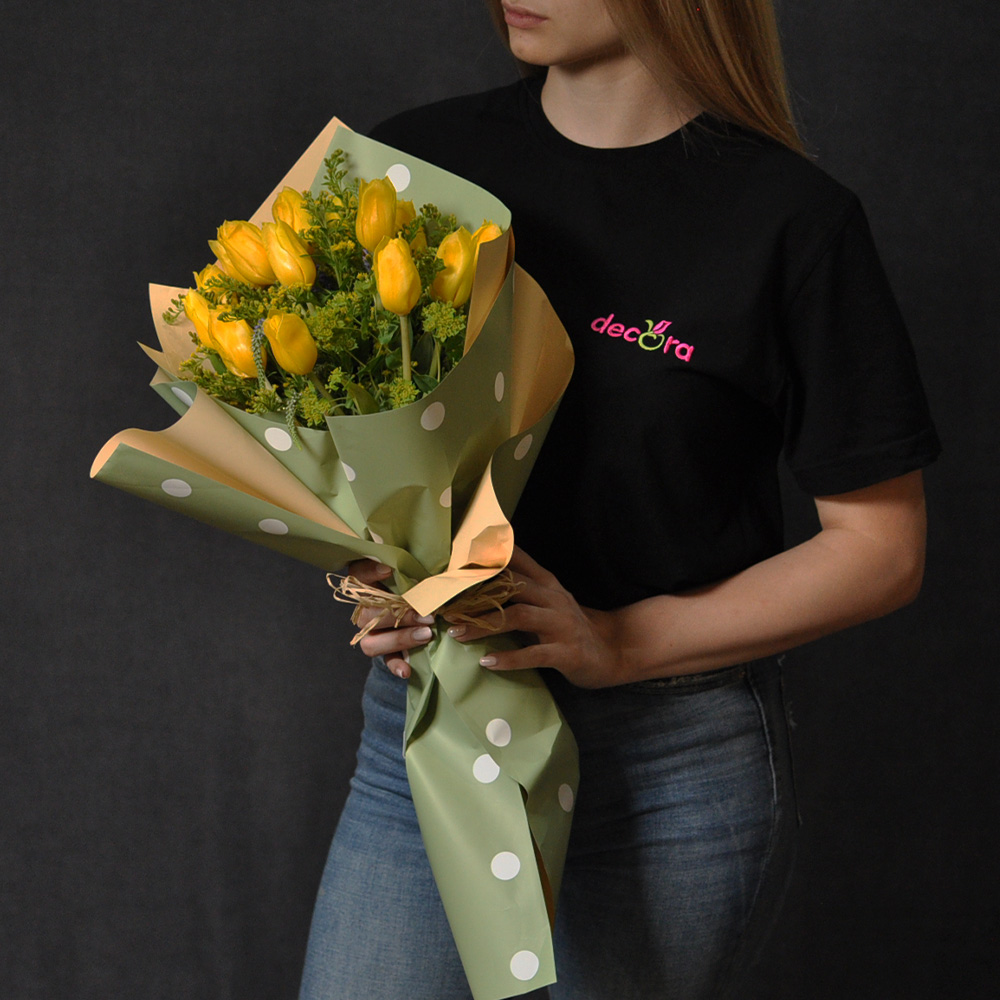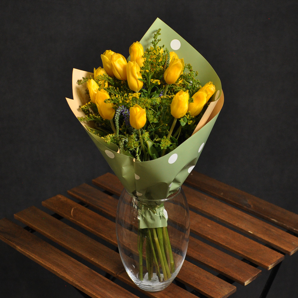 Buket od 15 žutih lala sa pratećim zelenilom.Boja i broj lala može biti po Vašem izboru po dogovoru.