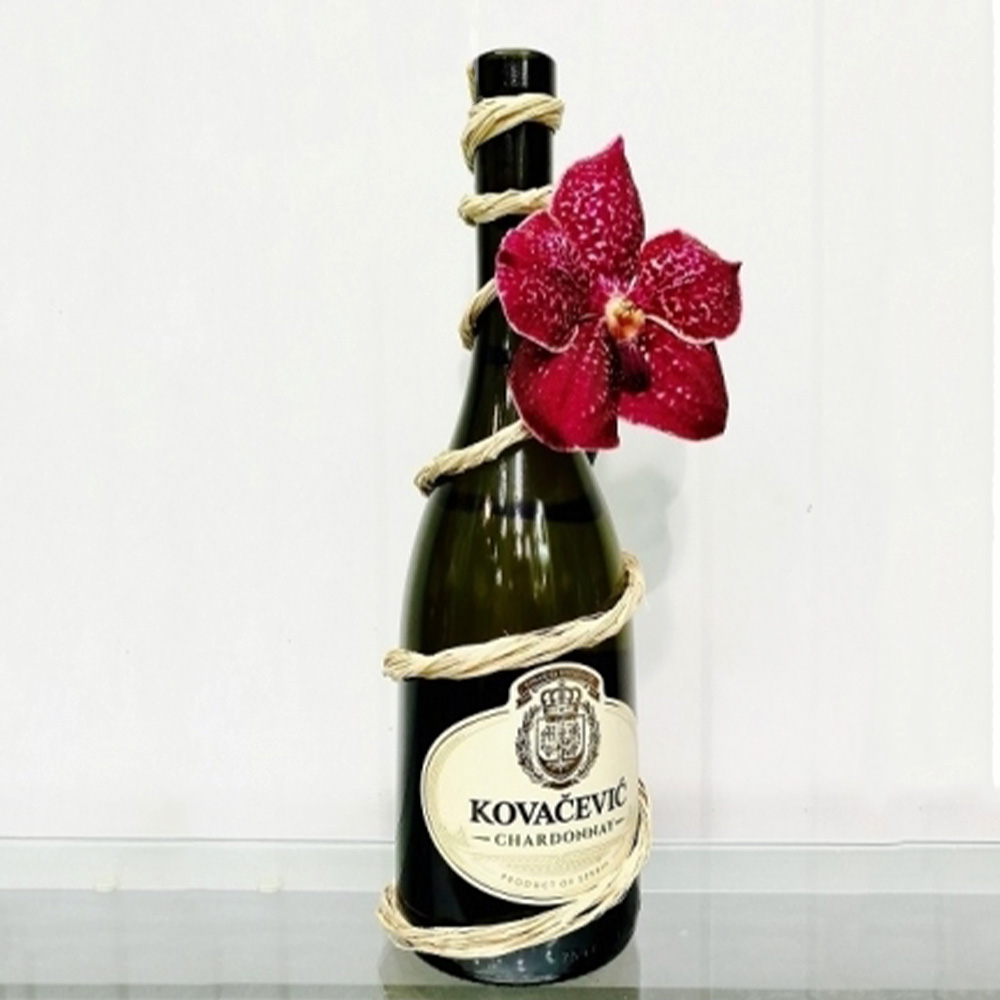 Boca kvalitetnog belog vina ukrašena cvetom orhideje.