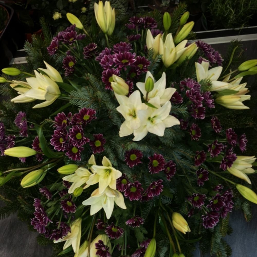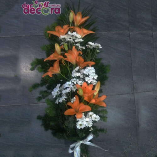 Venac sa ljiljanima,hrizantemom i pratećim zelenilom.